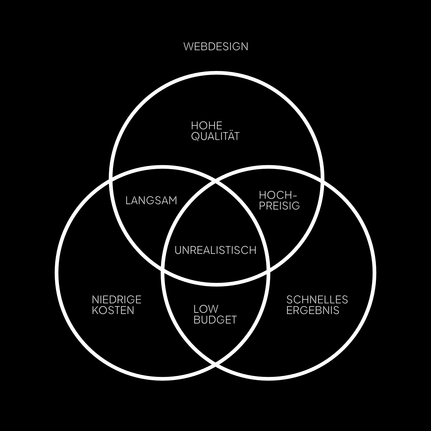 Diese Grafik ist eine gute erste Orientierung dafür, welche Kosten (Hochpreisig vs. Low Budget) für eine Website realistisch sind. Sie basiert auf das Konzept eines Venn-Diagramms. Die Kreise und Schnittmengen zeigen dabei, was passiert, wenn zwei oder drei Wünsche gleichzeitig erfüllt werden sollen. (Wikipedia)
